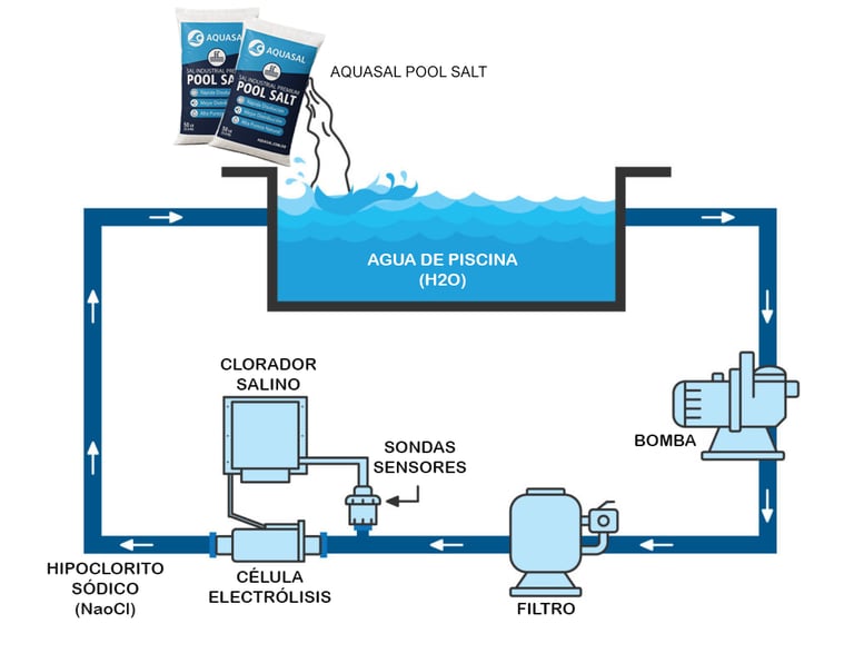 El procedimiento es sencillo: se agrega sal de alta pureza, como Pool Salt Aquasal, al agua de la piscina. Esta sal se disuelve y pasa por un dispositivo llamado clorador salino, el cual utiliza una corriente eléctrica de baja intensidad para transformar la sal (NaCl) en cloro natural. Este cloro actúa de inmediato como desinfectante, eliminando bacterias, virus, algas y microorganismos que puedan afectar la calidad del agua.